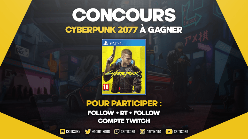 Critix est lancé ! Pour fêter cela nous vous offrons Cyberpunk 2077 sur la plateforme de votre choix. Cliquez sur l’affiche ci-dessous pour voir le tweet qui vous permettra de participer à ce concours.