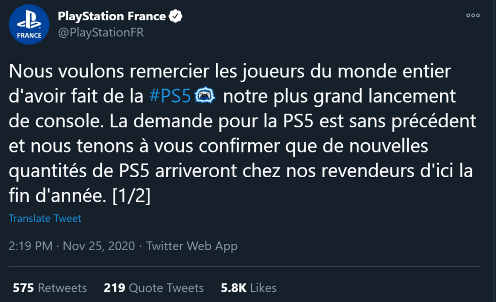 MAJ 22/12/2020 : Si vous nous suivez sur Twitter ou que vous suivez le très informé @PS5StockFR dont nous conseillons vivement le suivi et l’activation des notifications en cette période de rupture de stock vous avez pu recevoir en avant première l’information de la disponibilité des PS5 Standard et Digital en vente hier sur Auchan.fr aux alentours de 22h15. Si vous n’avez pas pu en récupérer une hier, pas de panique il semble que des stocks (très limités) arrivent cette semaine et même probablement dés demain, mercredi 23 décembre sur Amazon. Alors n’hésitez pas à repasser sur ce Hub PS5 qui sera mis à jour à chaque fois que des stocks seront constatés chez les différents sites ou de nous suivre sur notre compte twitter