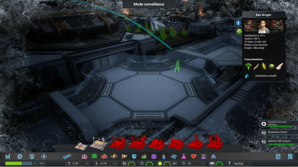 Car oui, un aspect souvent oublié des city builders, c’est la guerre. Pourtant, des jeux Sierra de l’an 2000 à tous ceux cités dans ce test, ont une composante militaire. Avec un aspect de gestion pas toujours réussi, mais ayant le mérite d’être intéressant. Ici, ce n’est pas le cas. Concrètement, dans vos parties, quatre choses extérieures seront dangereuses : la foudre. Il suffira alors de faire un paratonnerre par zone. Les spores infectieuses : des lasers et des hôpitaux suffiront. Des rebelles et des aliens hostiles dans des vaisseaux qui vous bombarderont : là encore, les lasers suffiront. Concrètement ? Comme pour le point précédent, il suffira d’avoir mis un laser par zone pour ne plus rien avoir à gérer lors des différentes crises hostiles.