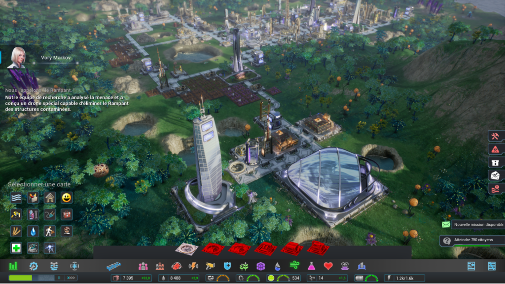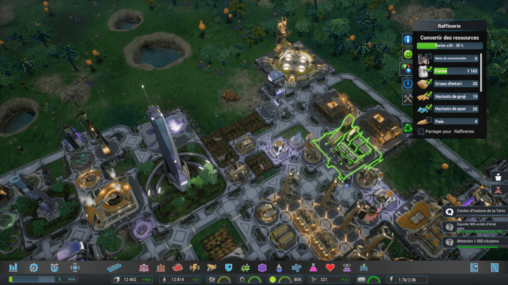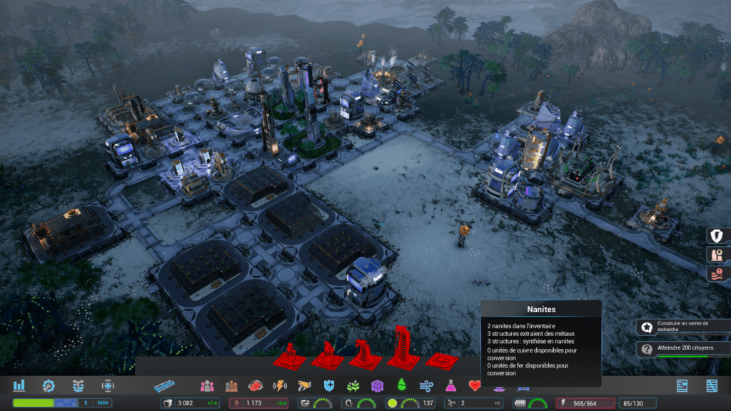 L’unique profondeur originale dans le jeu, sera proposée via le centre de recherche, l’usine chimique et la raffinerie, trois bâtiments vous permettront de chercher des technologies et brevets puis de combiner des ressources, dont certaines de prime abord inutiles pour en faire de la nourriture complexe ou des biens de consommation. Le souci principal de cette composante de gameplay reposera dans le fait qu’elle est inutile. Les biens de consommation rendront votre peuple heureux pour qu’ils vous réélisent. Hors, ils ne sont pas nécessaires pour que votre peuple soit dans d’assez bonnes conditions. Et pour la nourriture complexe, si vous produisez déjà assez de légumes différents, vos colons aurons assez de variétés alimentaire pour ne pas être en très mauvaise santé.