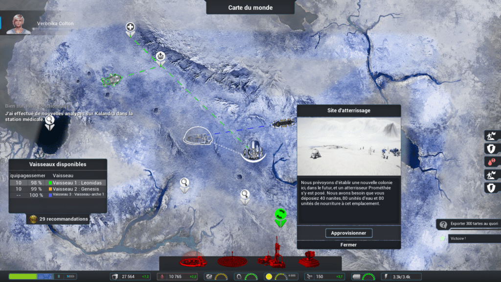 Le dernier point est si oubliable qu’on a failli ne même pas en parler. Tendant vers une approche du genre 4x, de manière tellement insipide qu’il sera facile d’en faire le tour. Une mappemonde vous permettra d’aller sur des points d’intérêts apparaissant aléatoirement. Vous pourrez alors envoyer un véhicule sauver des colons égarés (et il y en a sacrément souvent pour une colonie où les gens vivent constamment enfermés dans des zones sous oxygène artificiel.), explorer des points d’intérêts donnant des nanites (pour quelle raison logique ?) ou combattre des rebelles et détruire des nids de spores. Bien sur il s’agira d’une image de votre véhicule sur la carte du monde et vous n’aurez ni le compte-rendu de la bataille ni l’opportunité d’y gérer quoi que ce soit. Sur cette même vision satellite, vous pourrez à haut niveau, construire des mini bases de colons que là encore vous ne verrez qu’ en miniature sur la mappemonde. Celles-ci vous permettant de construire une centrale, des tourelles défensives pour prévenir des différentes attaques avant qu’elles ne soient sur votre ville, etc. Une bonne idée très sous-exploitée. On aurait aimé par exemple, pouvoir construire intégralement ses petites bases et aller et venir de l’une à l’autre ou que cela ouvre des routes commerciales spécifiques. Ce que font très bien de nombreux autres jeux de gestion (le dernier Sim City ou ceux d’impressions games).