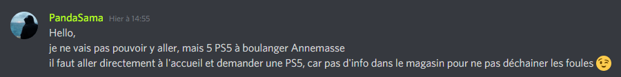 Certains membre sur notre Discord ont également repéré des PS5 disponibles physiquement en magasin comme nous pouvons le voir dans l’image suivante :