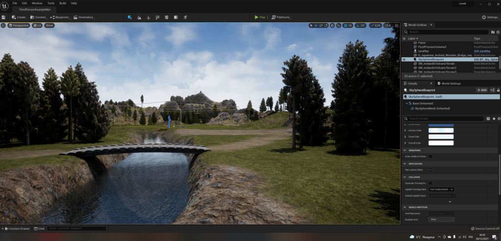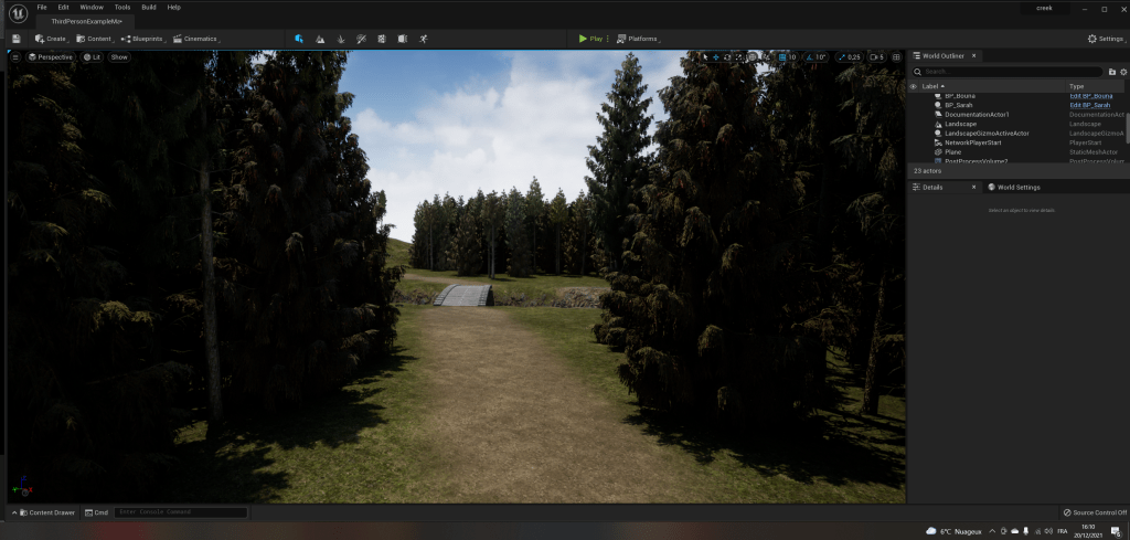 Les images ci-dessus ont été les premiers rendus de notre première vraie map sur l’Unreal Engine 5 en suivant les cours d’Unreal Sensei. Sur la dernière image on a ajouté de la brume volumétrique, des god rays qui traversent des arbres, un peu de relief aux passages boueux via la bibliothèque Quixel et plus encore. Le travail intégral est disponible juste ici en timelapse